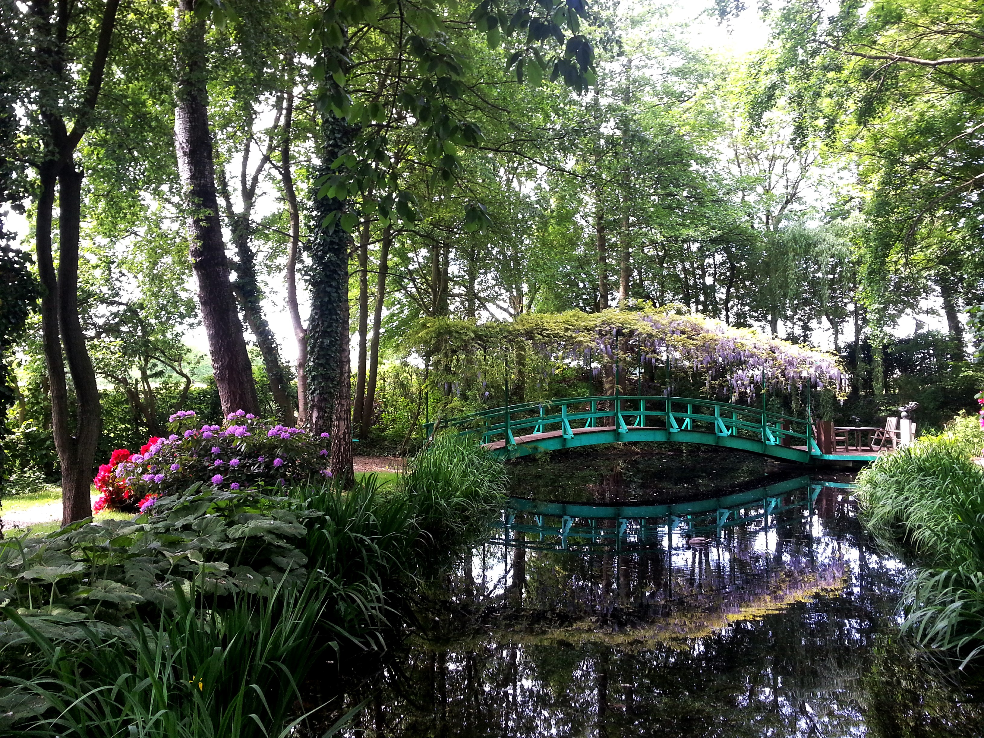 Spaziere durch das Grün und überquere das Wasser über Paulettes Brücke. Genieße die Natur und die Blumen und entdecke unterwegs die Werke, die mit Licht, Raum und Natur spielen.