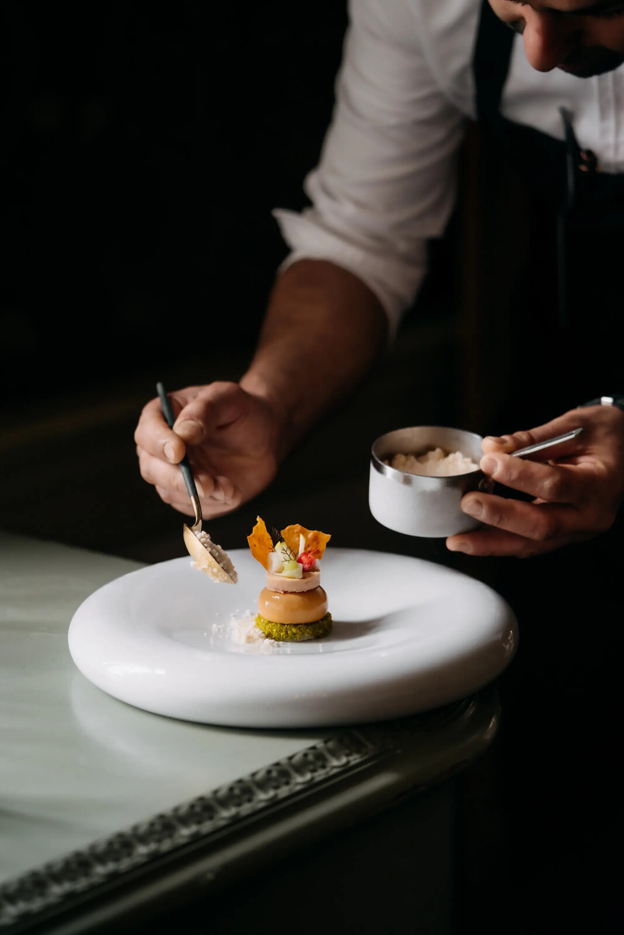 Das kulinarische Erlebnis beginnt mit drei raffinierten Amuse-Bouches, gefolgt von zwei Gerichten, die mit Zutaten aus eigenem Anbau und lokalen Produkten zubereitet werden.